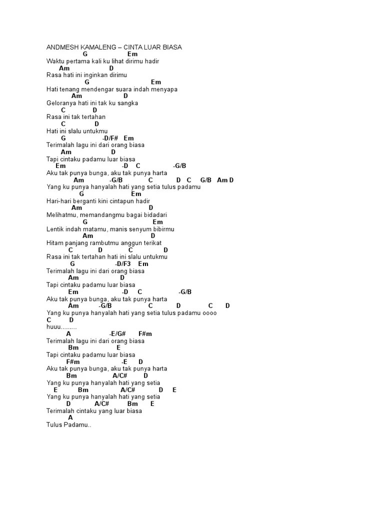 Lirik lagu cinta luar biasa dinyanyikan dan dipopulerkan oleh penyanyi jebolan ajang pencarian bakat menyanyi rising star indonesia andmesh . 1,274,263 views, added to favorites 4,483 times. Itu tadi chord kunci gitar cinta luar biasa andmesh kamaleng. Request chord services , organizes chords . Capo fret 2 intro : C waktu pertama kali am ku lihat dirimu hadir dm rasa hati ini g . Terimalah cintaku yang luar biasa. G waktu pertama kali em ku lihat dirimu hadir am rasa hati ini d inginkan dirimu. Ini adalah blog khusus kumpulan kunci gitar lagu terupdate | a special blog of guitar chords updated. ➖ ➕ ⌛ autoscroll lirik.